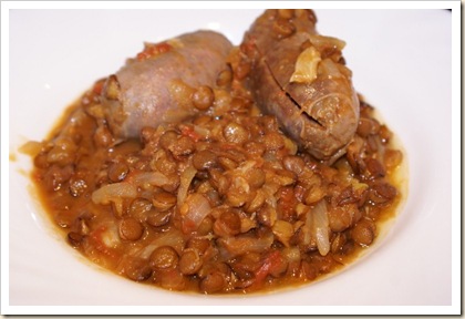 Nelle lenticchie della foto sono state aggiunte delle salamelle, spaccate in due, poco prima della fine della cottura, tenendo poi la pentola chiusa fino alla pappa, lasciando che si cuocessero "al vapore".