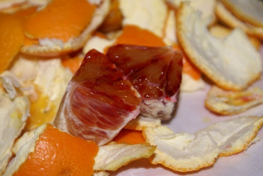 Poi le arance si sbucciano bene bene, togliendo TUTTO il bianco (che è una cosa lungaaa..) e poi si tagliano a pezzoni.